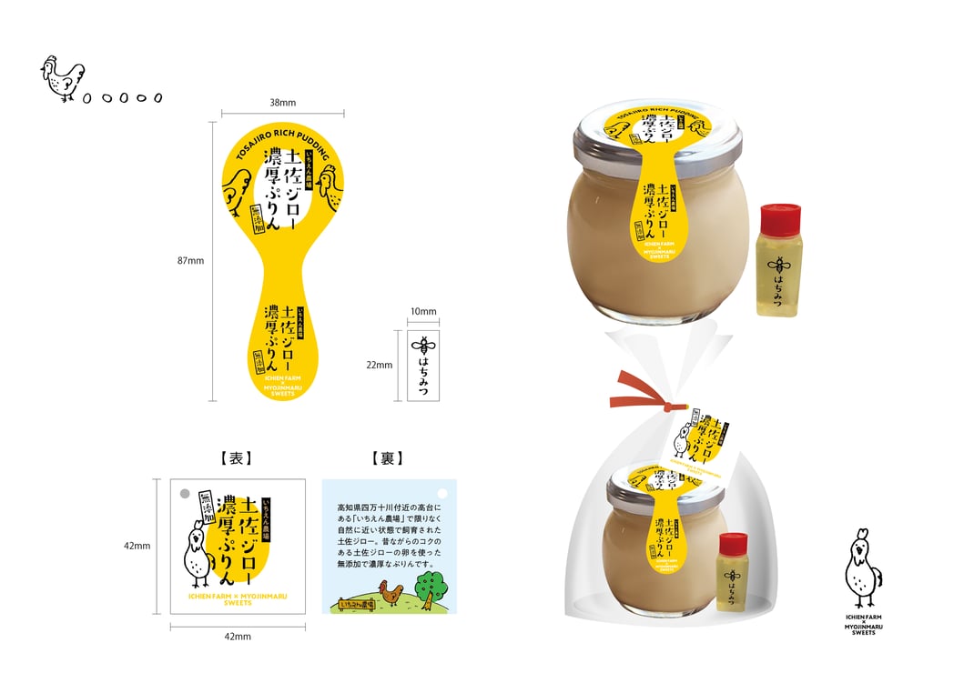 商品パッケージデザイン / Package design · 2021/04/15 MYOJINMARU SWEETS いちえん農場 土佐ジロー濃厚プリン client / 株式会社明神丸 tagPlaceholderカテゴリ: works, 明神丸, 2021, プリン